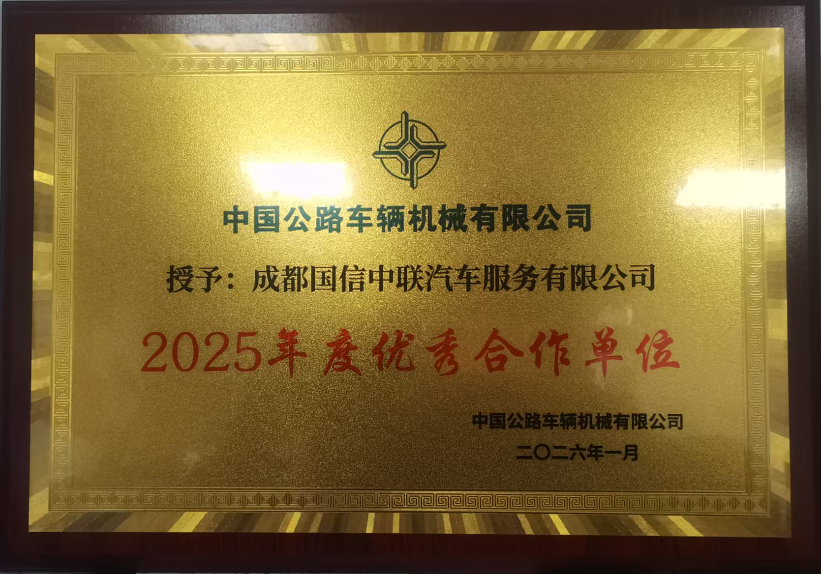 2026年1月8日,在中国公路车辆机械有限公司(以下简称“中交公司”)供应商大会上,成都国信中联汽车服务有限公司被授予“2025年度优秀合作单位奖”。自2025年6月双方签订《车辆租赁服务框架协议》以来,国信公司以高效、专业的服务迅速获得中交公司的认可与信赖,建立起稳固合作关系。该奖项是对国信公司服务品质与履约能力的高度评价。(中国公路车辆机械有限公司是中国交通建设集团有限公司(中交集团)全资子公司,总部位于北京,是中国最早专注于公路运输车辆及关键零部件研发、制造、销售与服务的企业之一,业务覆盖客车、专用车、新能源车辆及相关配套产业,是国家级高新技术企业。)