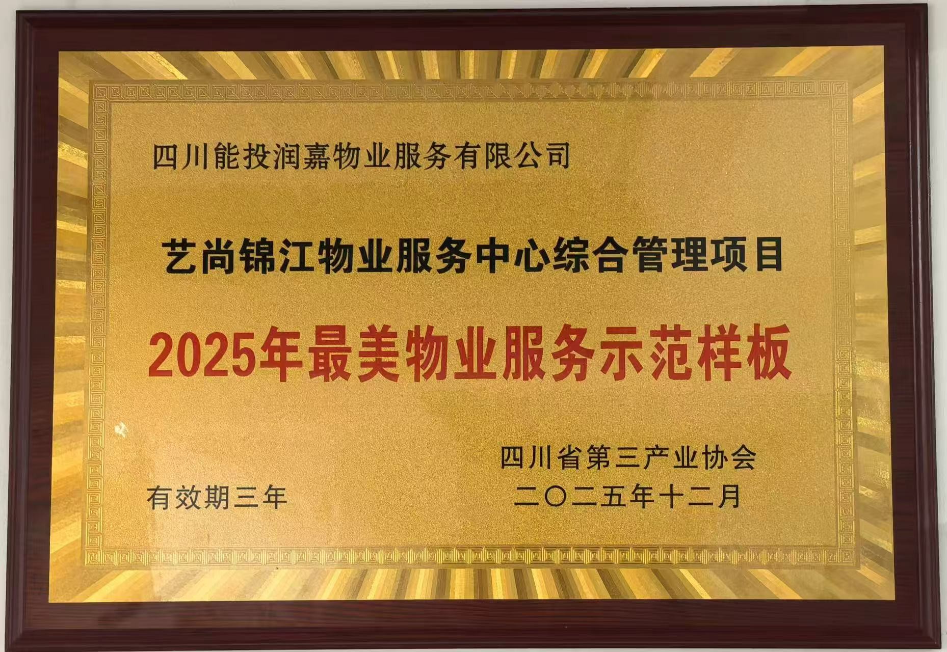 近日,由四川省第三产业协会主办的2025年“最美物业服务示范样板”评选活动圆满落幕。四川能投润嘉物业公司艺尚锦江项目部凭借规范的管理体系、精益求精的服务品质与特色示范亮点,荣获“最美物业服务示范样板”荣誉称号,充分彰显了行业对项目物业服务工作的高度认可与专业肯定。
