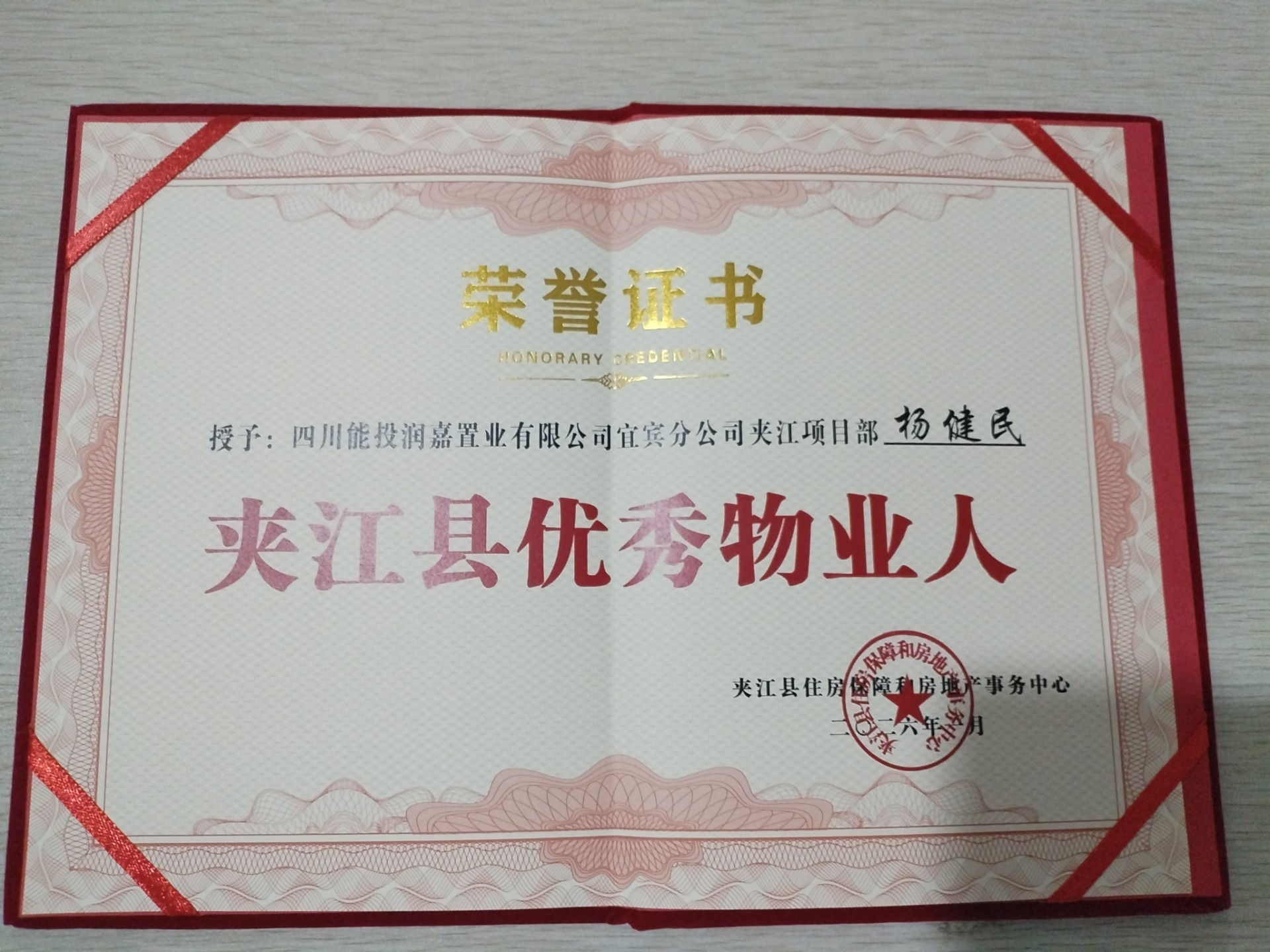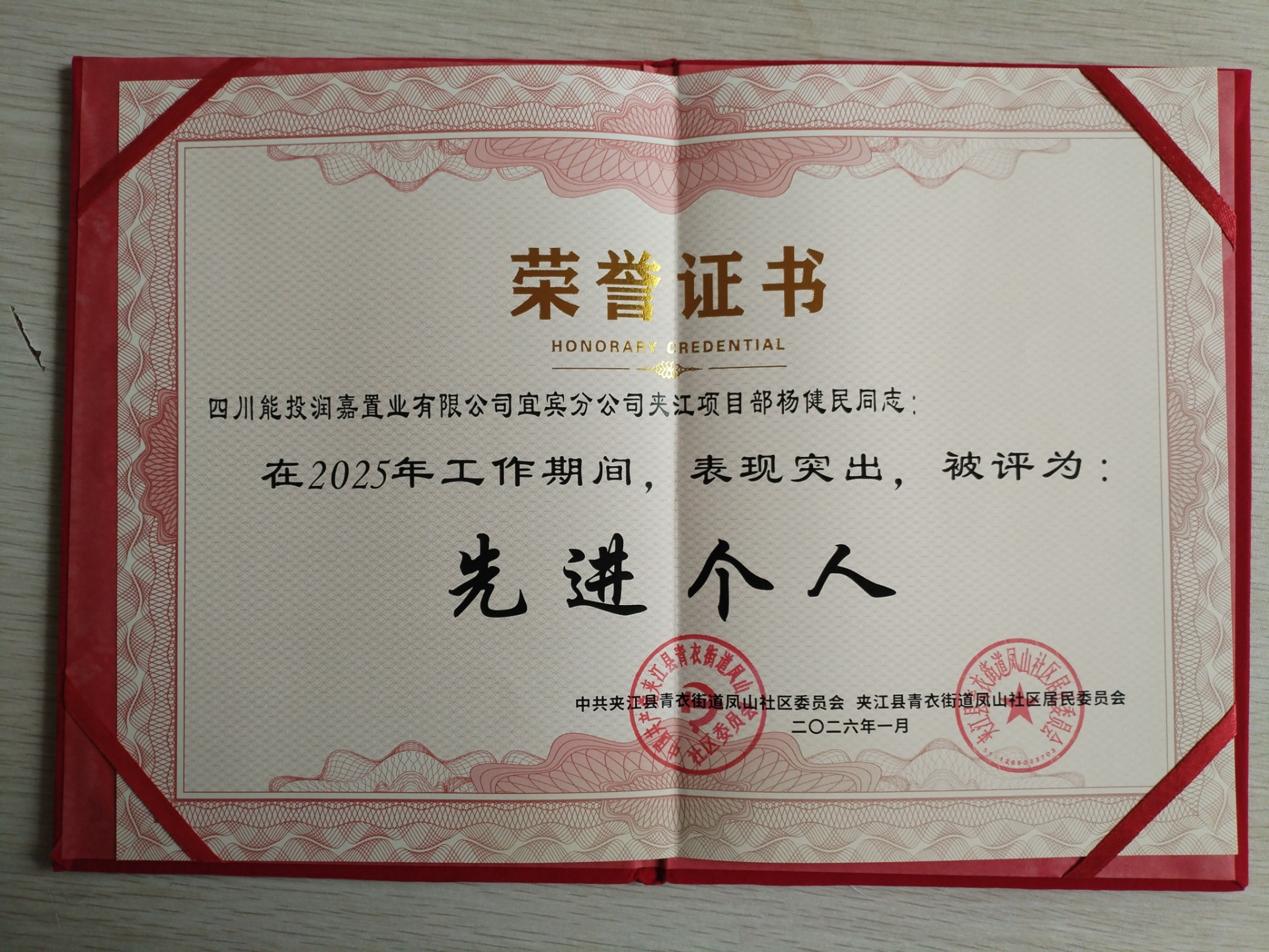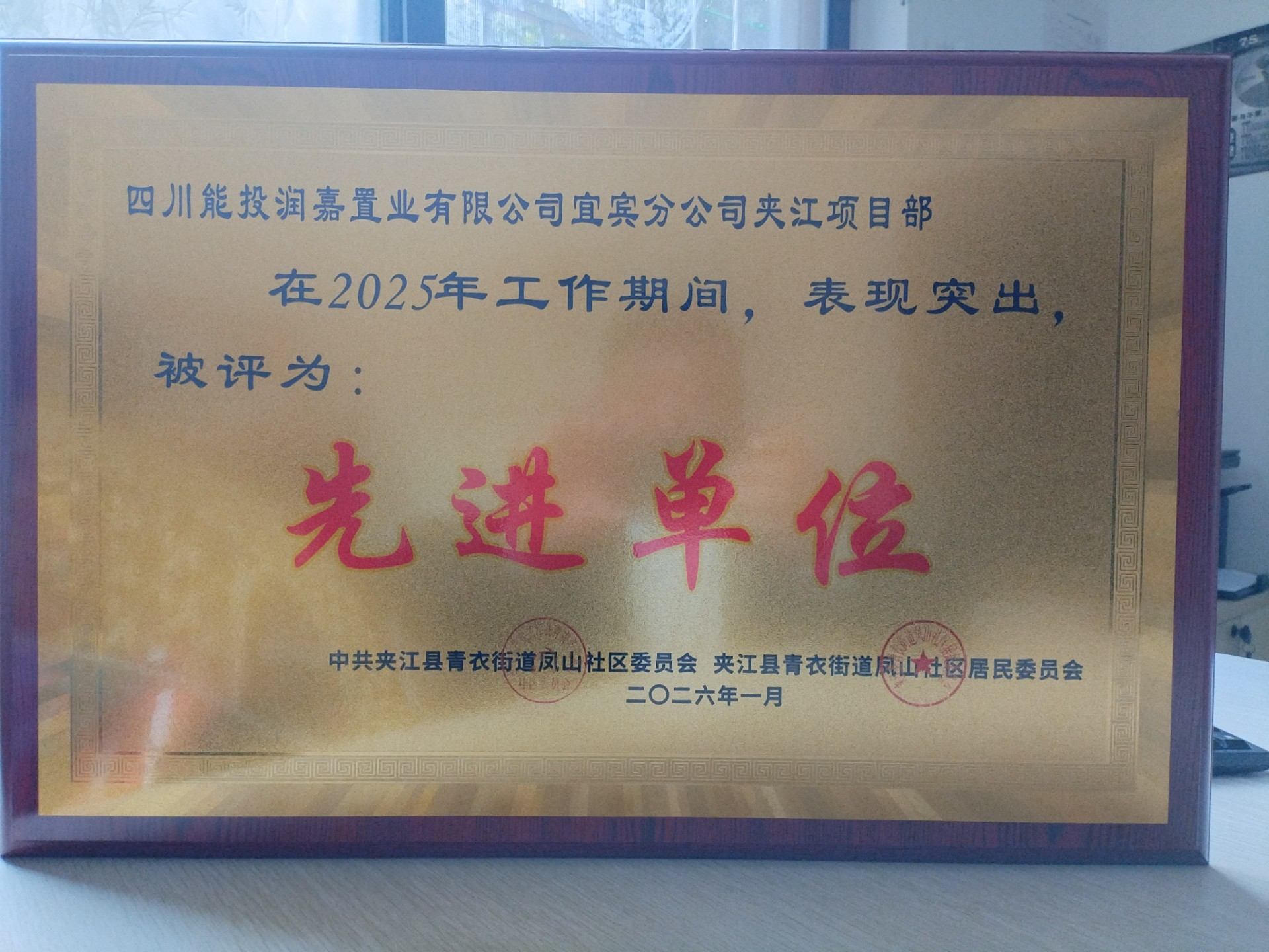近日,四川能投润嘉公司宜宾分公司夹江项目部荣获夹江县青衣街道凤山社区党委授予的“2025年度先进单位”,项目部经理杨健民荣获夹江县住房保障和房地产事务中心、夹江县青衣街道凤山社区党委授予的“夹江县优秀物业人”“2025年先进个人”荣誉称号。